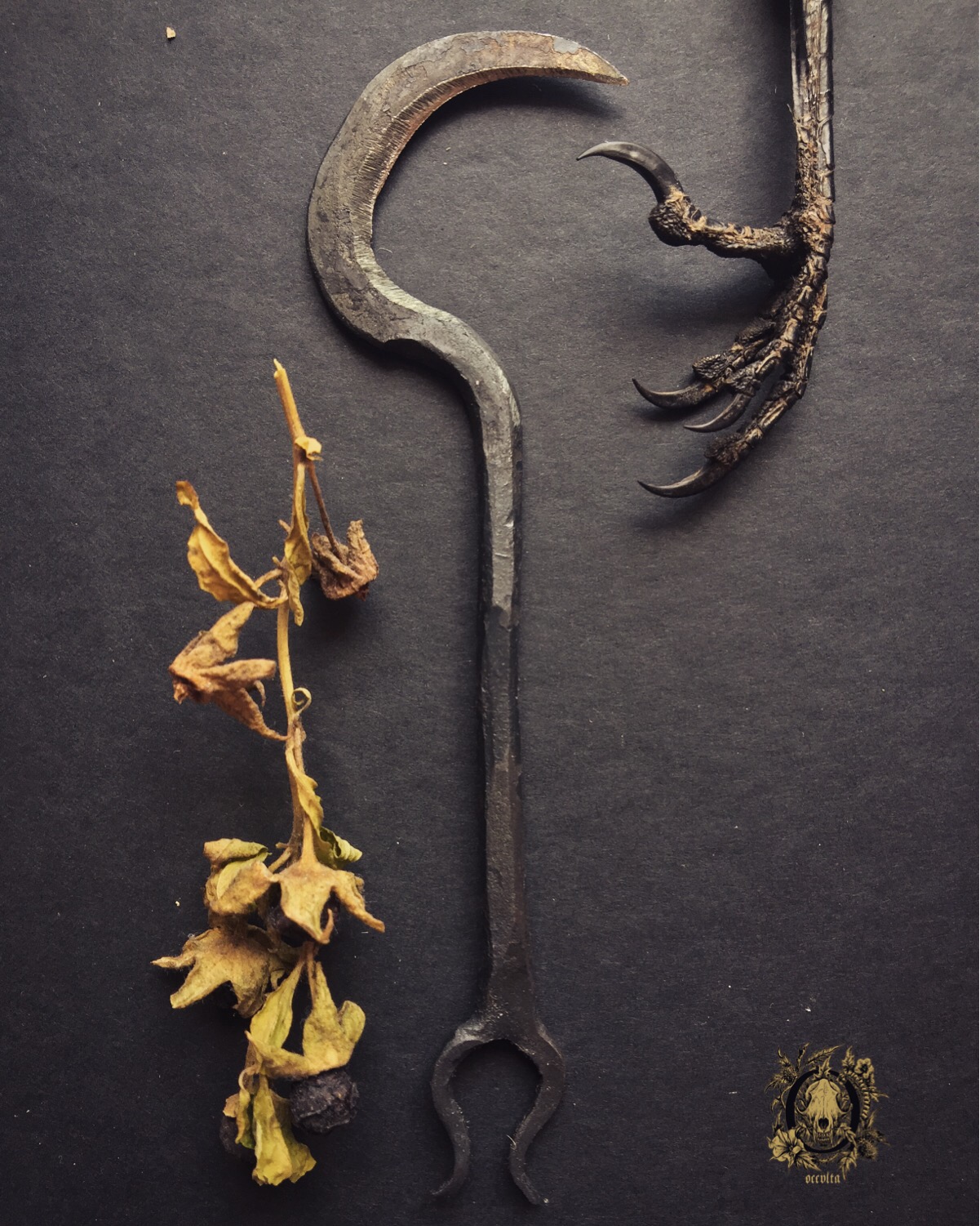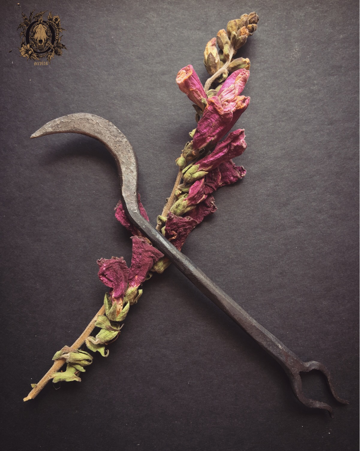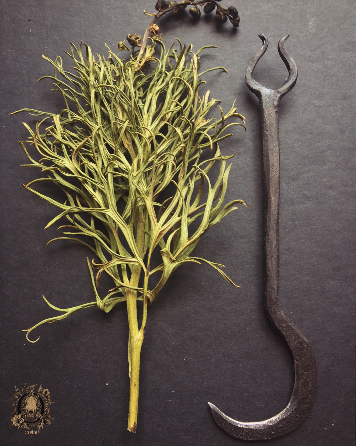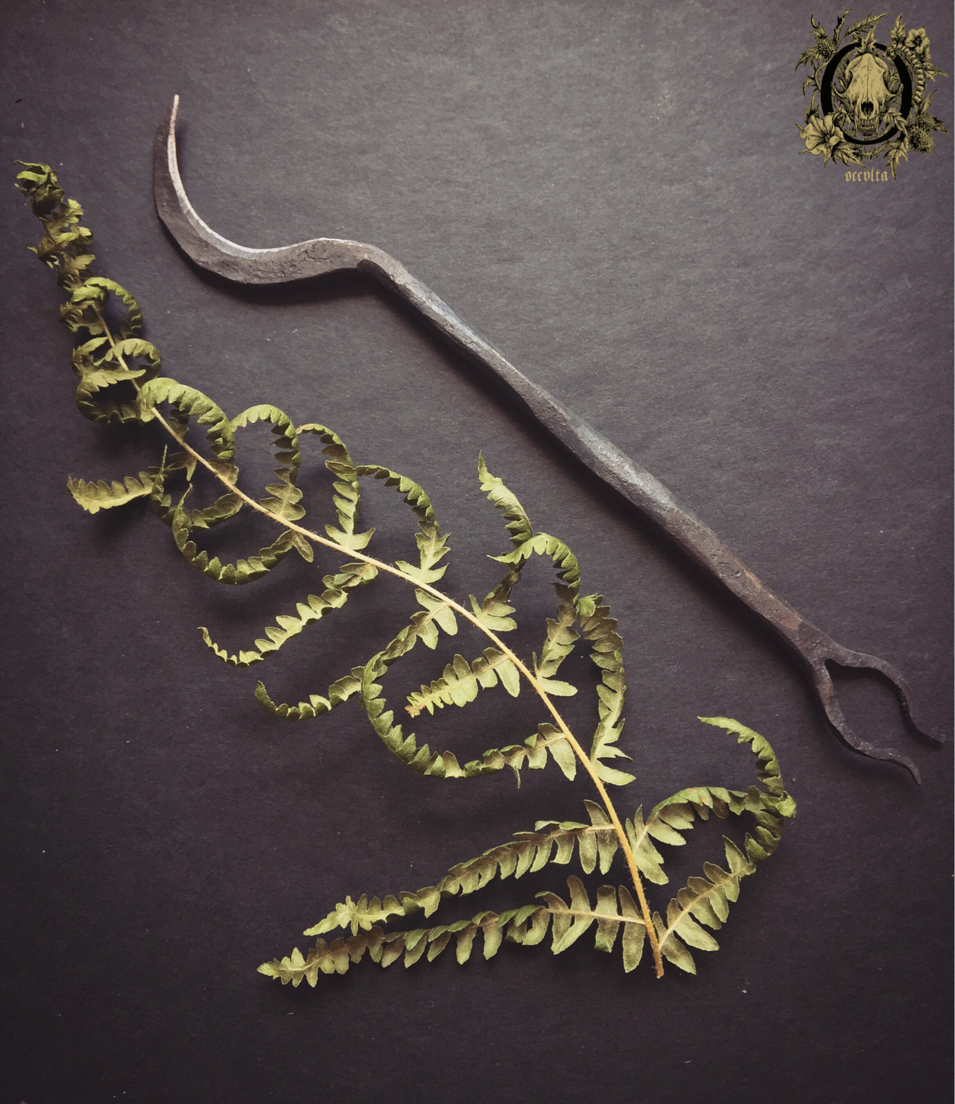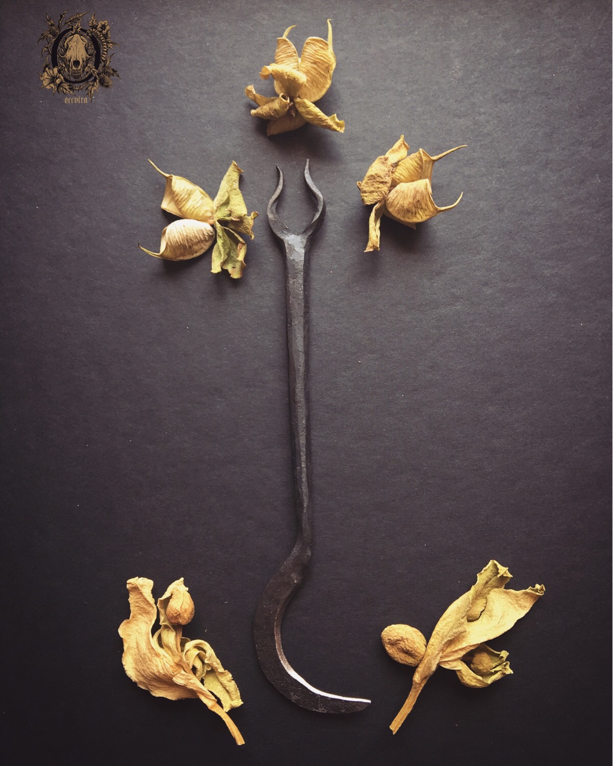 Today we received six harvesting knives wonderfully envisioned and hand crafted by Cody Dickerson from Borealis Ironworks (you can find his fantastic Etsy shop in here), which will integrate the upcoming Harvester Sets (composed of a harvest/gathering knife and an oil to anoint the blade before the harvesting ritual). They are perfect sized (portable and easily conceivable), their blade is sharp, and their little horns are a helpful ally when unearthing roots.
